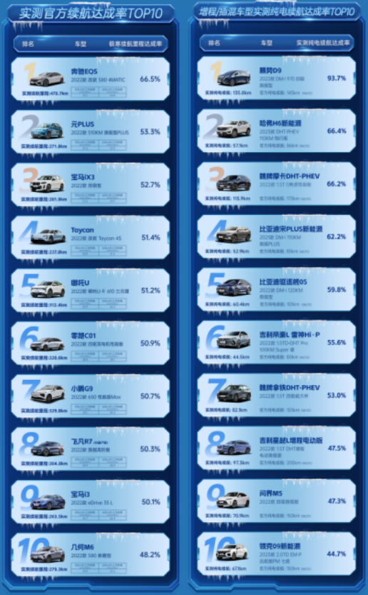 在北京低温测试中,纯电车型续航均值为425.8公里,与官方的续航里程相比,达成率均值为71.8%,在榜单前三名中,排名第一的Taycan车型续航达成率高达104.5%,国产品牌几何M6以80.3%的续航达成率排名第三;在极寒温度下,新能源的续航能力集体大打折扣,其中,在极寒纯电动车型实际续航达成率榜单中,续航能力排名第一的奔驰EQS仅为66.5%,甚至部分车型实测官方续航达成率不足4成,而在极寒增程插/插电混动车型实测纯电续航达成率排行榜中,排名第一的腾势D9续航达成率达93.7%,而排名第十的理想L8纯电续航里程相较于官方仅不到40%,在极寒环境下,增程/插电组的保电油耗变化幅度高达43.49%。可见,极寒温度对新能源车而言是严峻的挑战,在常温与极寒中,掌握车型续航的阈值,及时发现用车的问题,对用户的选购及出行有很大的参考价值。
