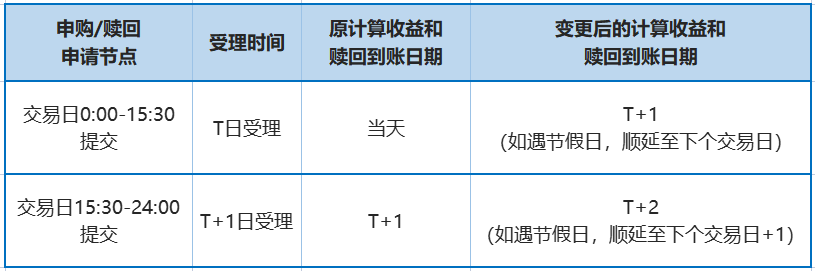 ▶举个例子,某款由本来“T+0”变更为“T+1”的现金管理类理财产品的申购/赎回受理时间变化如下表所示:
