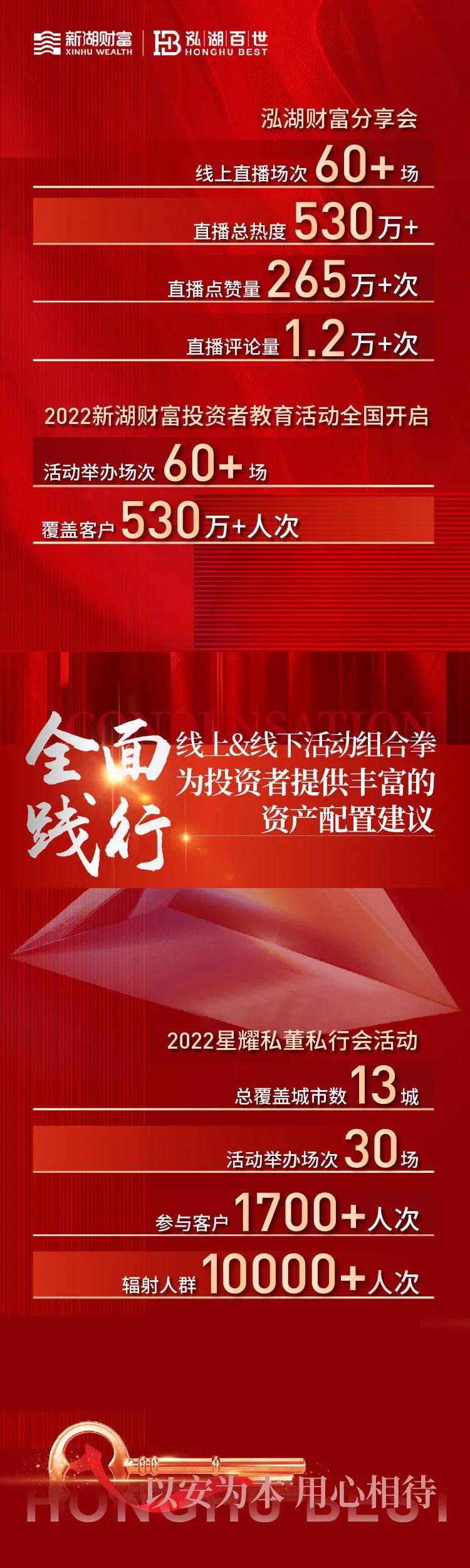 2022年是新湖财富迈向第二个十年的起点,公司坚持以客户为导向的服务理念,真正从买方立场打造以资产配置服务能力为核心的管家式服务模式,从广大投资者的利益角度出发,深耕专业领域,帮助投资者打开全球化视野。