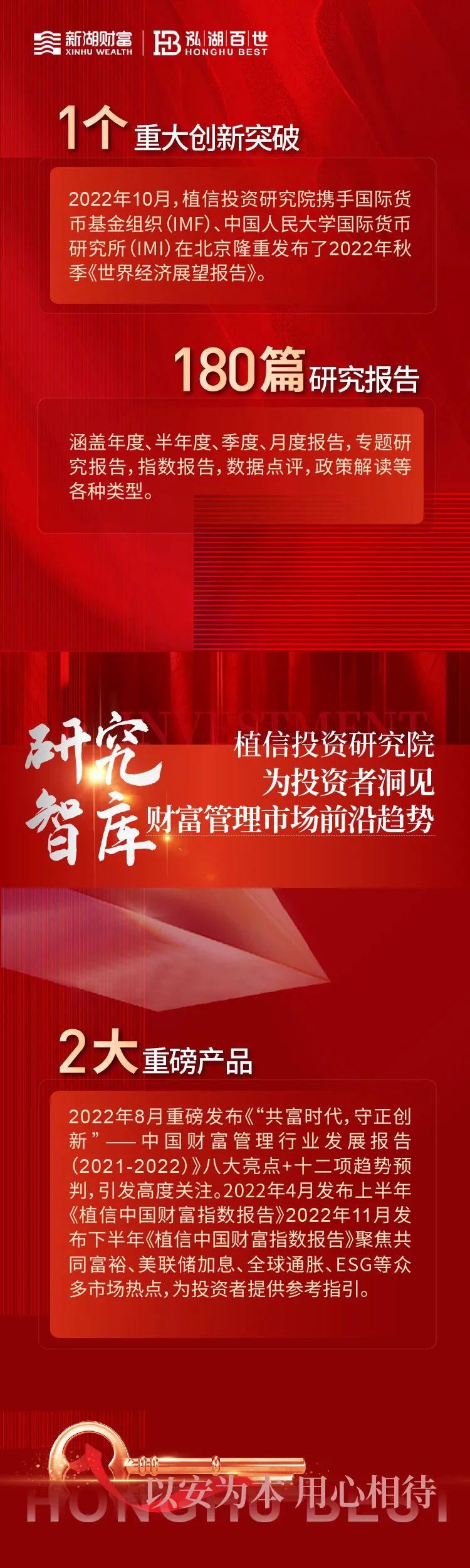 2022年,新湖财富一直以为客户提供安心服务为己任,注重服务高品质,旗下财富管理专业智库植信投资研究院以专业力量来把握宏观经济和金融市场走势,为广大投资者把稳投资方向提供科学支撑,持续为投资者普及长期、理性和科学严谨的投资理念,不断弘扬行业守正创新、规范健康发展正能量,在行业和市场树立了一流的口碑。