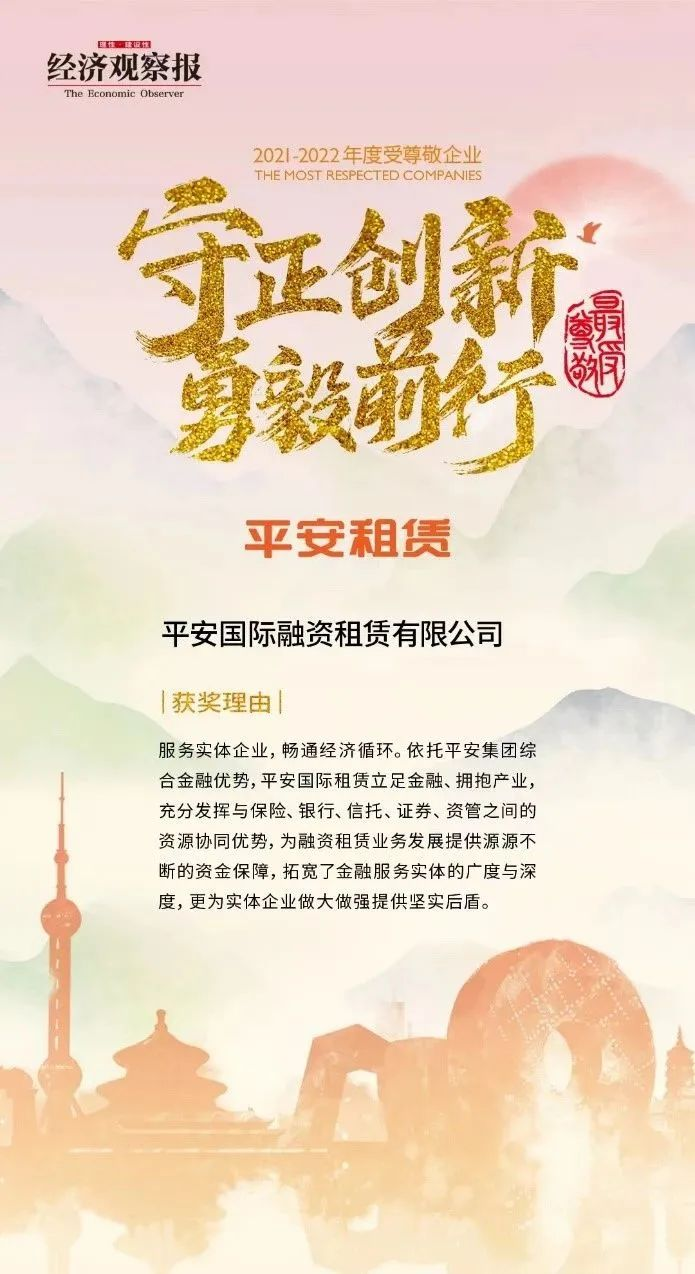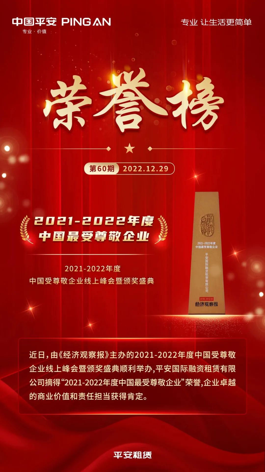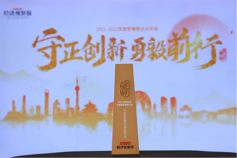 2021-2022年度中国受尊敬企业线上峰会暨颁奖盛典举办,平安国际融资租赁有限公司(以下简称“平安租赁”)摘得“2021-2022年度中国最受尊敬企业”荣誉,企业卓越的商业价值和责任担当获得肯定。