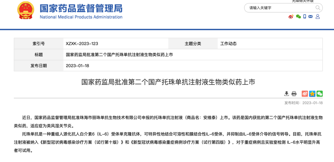 1月18日,国家药品监督管理局批准珠海市丽珠单抗生物技术有限公司申报的托珠单抗注射液(商品名:安维泰)上市。该药是国内获批的第二个托珠单抗注射液生物类似药,适应症为类风湿关节炎。据药监局文件显示,托珠单抗注射液被纳入《新型冠状病毒感染诊疗方案(试行第十版)》和《新型冠状病毒感染重症病例诊疗方案(试行第四版)》。