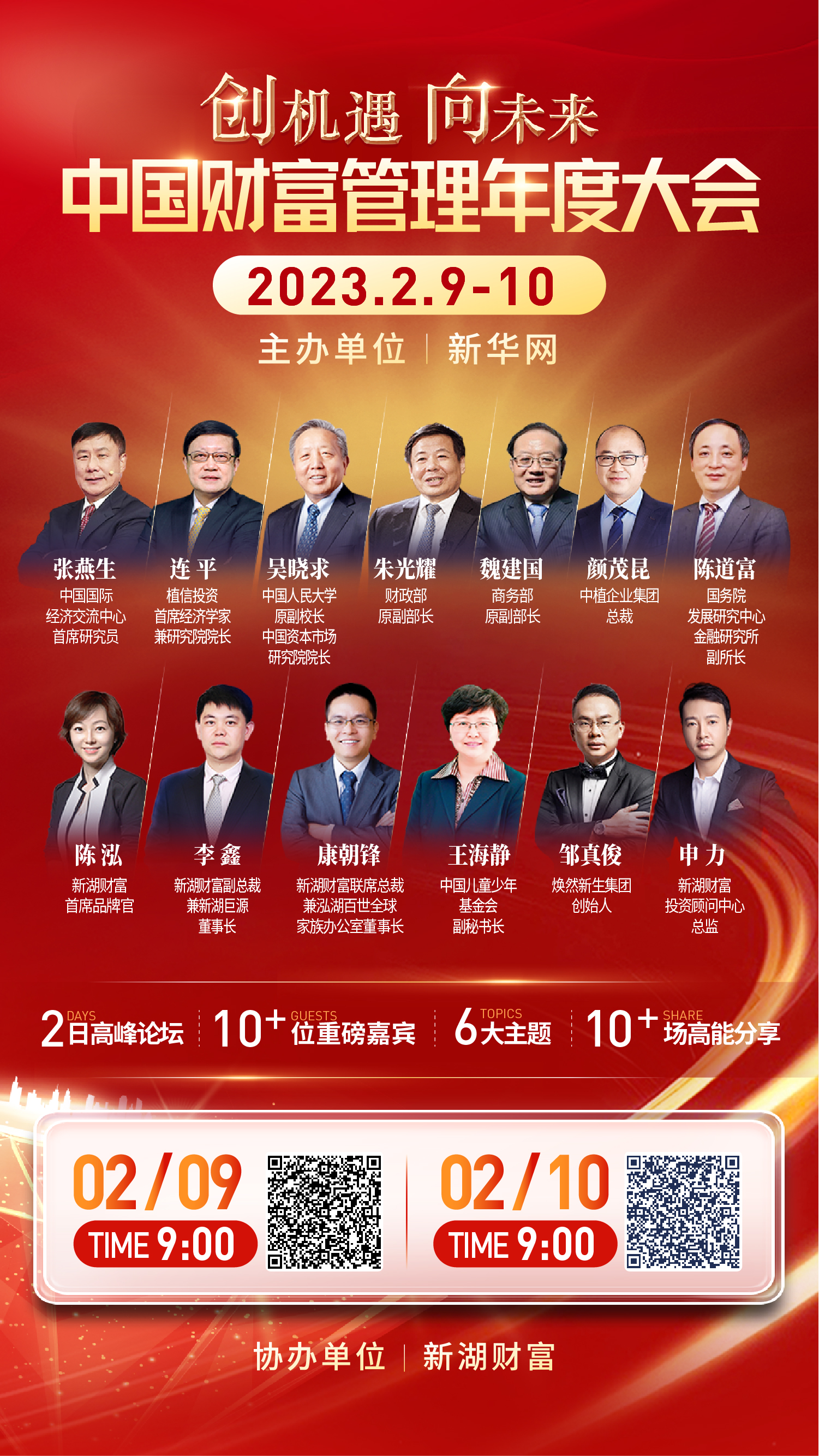 在此背景下,为聚焦新形势下财富管理新理念,探索财富管理行业发展新趋势,由新华网主办、新湖财富协办的中国财富管理年度大会将于2月9日—10日在线上举行。大会以“创机遇 向未来”为主题,围绕当前行业热点话题,邀请业内专家学者共聚一堂,探讨新机遇,交流新经验,寻觅新动能,为财富管理行业高质量发展建言献策、凝聚力量。