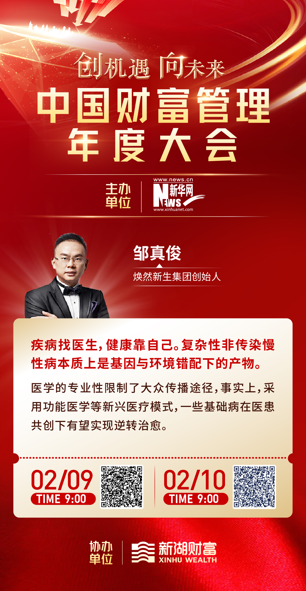 2月9日—10日,由新华网主办、新湖财富协办的中国财富管理年度大会在线上举行。焕然新生集团创始人邹真俊表示,在家庭里面,通过家庭成员整体健康商数提升,从认知到行为进行健康管理,优化家庭的生活方式,积极的预防有助于远离慢病。对于已经罹患慢性病的家庭成员,要努力在第一时间“逆转”慢病,带动整个家庭的健康,采用个性化健康管理模式,实现家庭成员的整体健康。