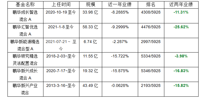 梁浩管理的偏股混合型鹏华成长智选混合A在管规模33.98亿元,近一年业绩为-8.2885%,大大低于同类平均业绩为-3.6%,同类排名为4308/5928。该只基金近两年业绩为-11.31%,合计亏损4.86亿元。