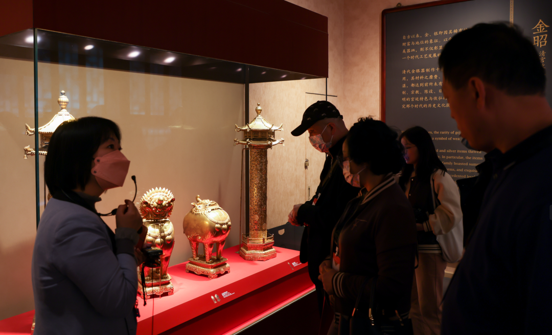 课后,故宫研习活动的老师带领学员们去到了珍宝馆,那里收藏着大量金银玉翠、奇珍异宝制成的礼器、祭器、冠服、装饰品、生活用品以及宫室内的陈设品等。在阳光明媚的午后,在故宫皇极殿珍宝馆中,学员们一边欣赏馆藏珍品,一边听取专业讲解员现场讲授每件瑰宝的鉴赏知识。学员们具体而生动的感受到瑰宝中蕴涵的博大精深的中华民族智慧和文化精神。这也为本次传统与现代交融的春意之旅划下了圆满的句号。