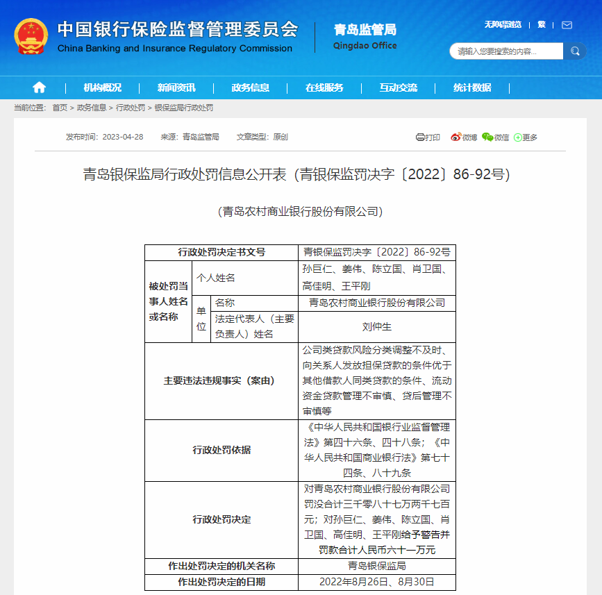 4月28日,因公司类贷款风险分类调整不及时向关系人发放担保贷款的条件优于其他借款人同类贷款的条件、流动资金贷款管理不审慎、贷后管理不审慎等原因,青岛银保监局依法对青岛农村商业银行股份有限公司罚没合计3087.27万元;对孙巨仁、姜伟、陈立国、肖卫国、高佳明、王平刚给予警告并罚款合计人民币61万元。