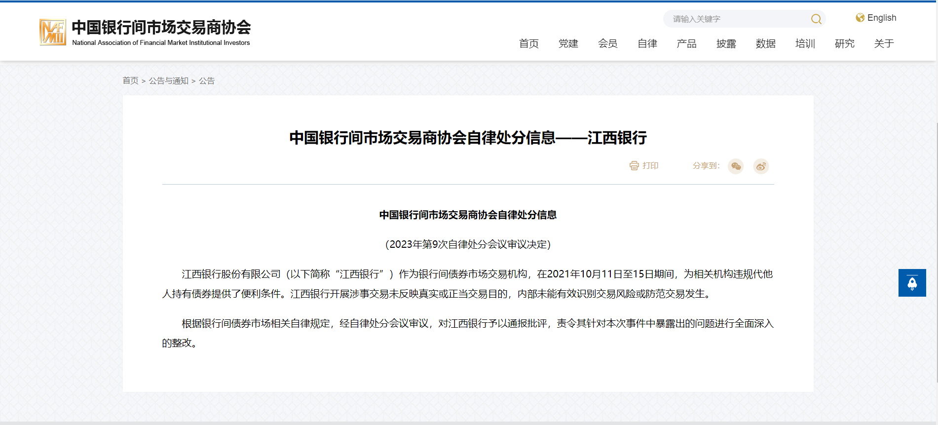 5月8号,中国银行间市场交易商协会网站公布的自律处分信息显示,江西银行股份有限公司(以下简称“江西银行”,01916.HK)作为银行间债券市场交易机构,在2021年10月11日至15日期间,为相关机构违规代他人持有债券提供了便利条件。江西银行开展涉事交易未反映真实或正当交易目的,内部未能有效识别交易风险或防范交易发生。