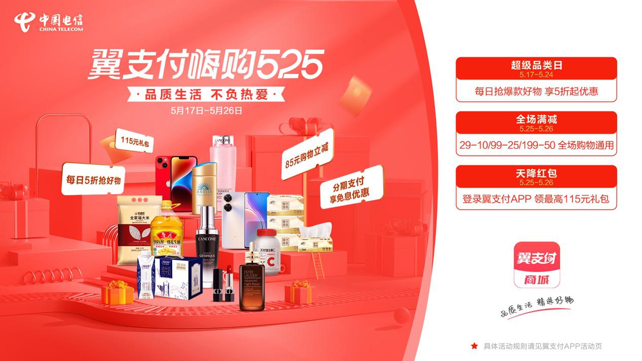 5月17日,中国电信翼支付启动“嗨购525”活动,活动以“品质生活 不负热爱”为口号,依托平台资源优势,为消费者带来千余款央企及地方名优特产好物,并推出精彩纷呈的福利特惠,以品质消费体验助推经济增长。