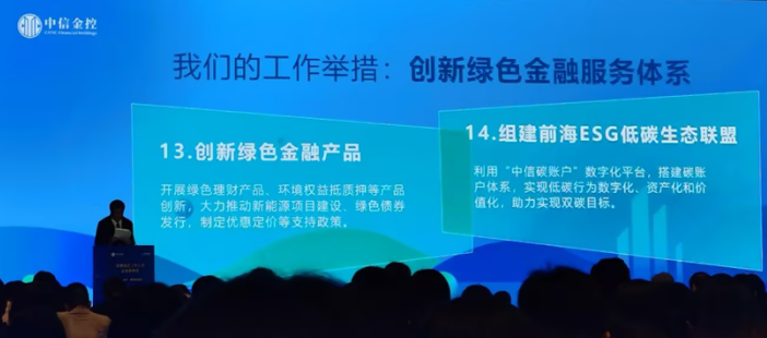 近日,中国中信金融控股有限公司(以下简称“中信金控”)在深圳前海举办深港地区上市公司企业家峰会,联合前海创新研究院共同发布《中国中信金融控股有限公司落实“金融支持前海30条”1030行动方案》(以下简称“1030行动方案”),并与前海管理局签署战略协议。会上,中信金控向15家企业家办公室成员单位授牌,共同启动了“前海ESG低碳生态联盟”,提出在发展绿色金融服务方面,将通过创新绿色金融产品和组建前海ESG低碳生态联盟等两大举措,构建创新绿色金融服务体系,利用“中信碳账户”数字化平台,搭建碳账户体系,助力企业实现低碳行为数字化、资产化和价值化。