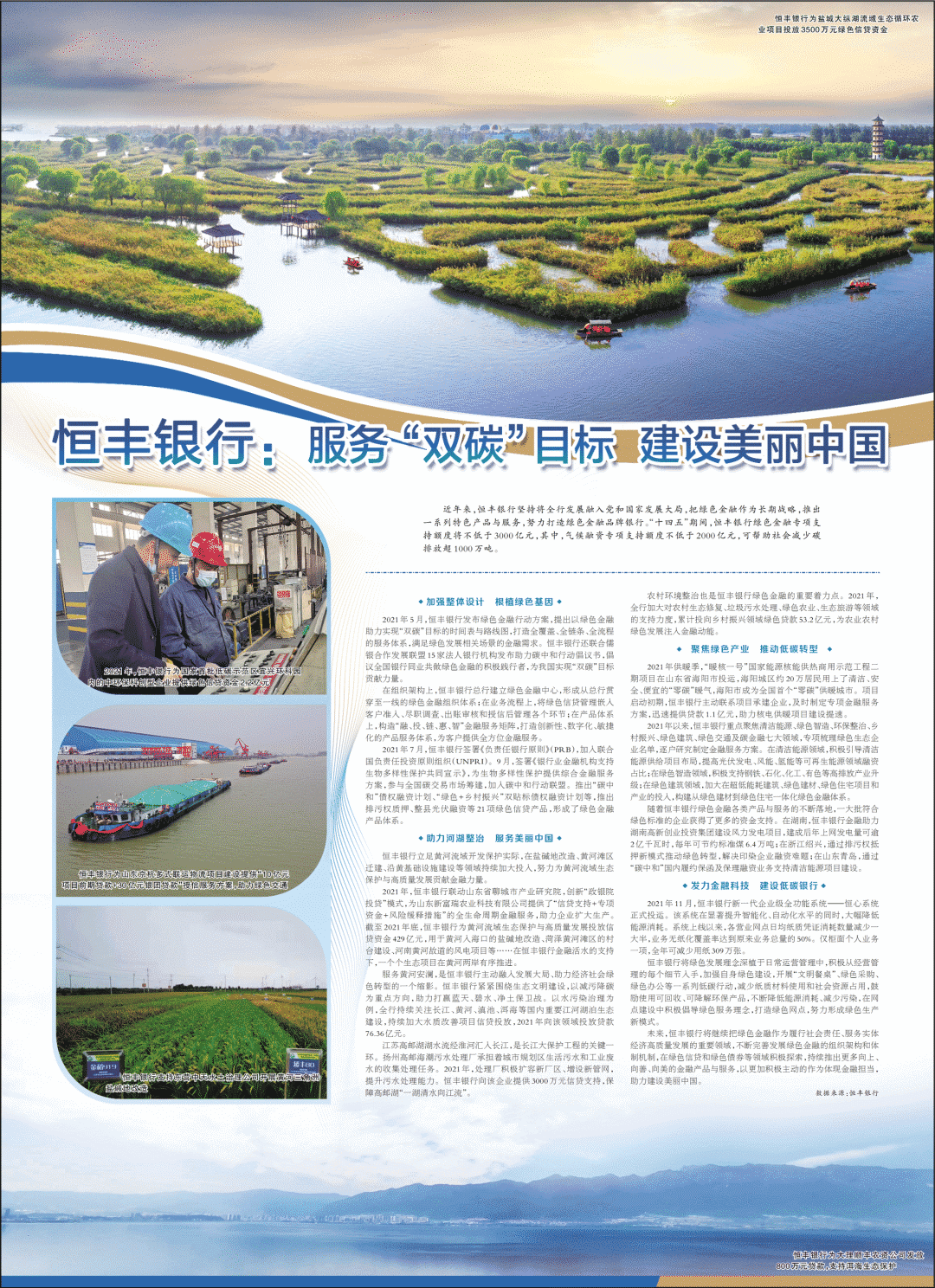 2021年8月,恒丰银行签署《负责任银行原则》(PRB),加入联合国环境规划署金融倡议(UNEP FI)。10月,签署《银行业金融机构支持生物多样性保护共同宣示》,为生物多样性保护提供综合金融服务方案,参与全国碳交易市场筹建,加入碳中和行动联盟。推出“碳中和”债权融资计划、“绿色+乡村振兴”双贴标债权融资计划等,推出排污权质押、整县光伏融资等21项绿色信贷产品,形成了绿色金融产品体系。