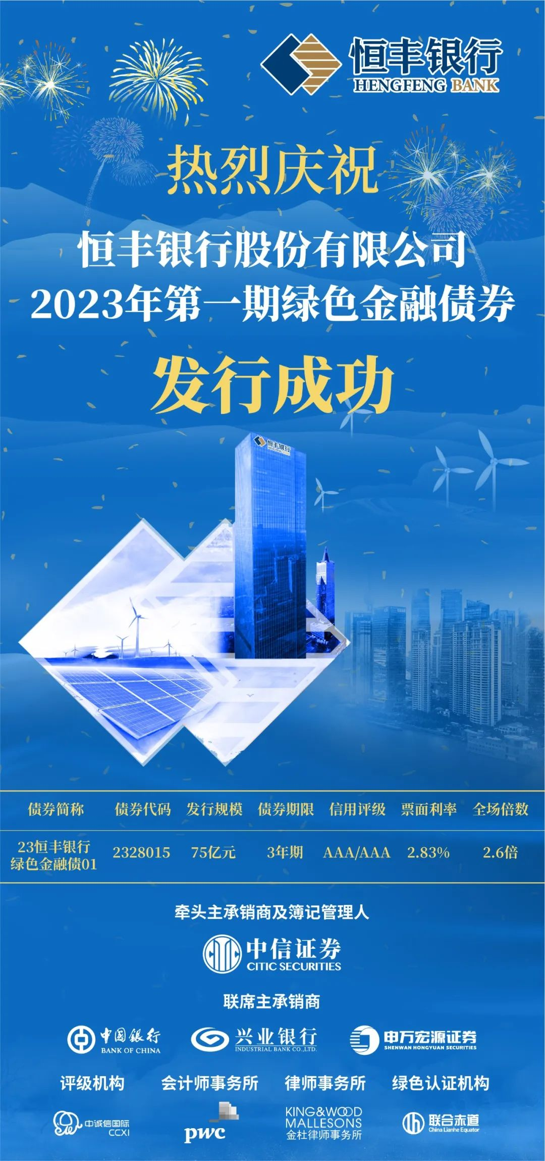 5月16日,恒丰银行2023年第一期绿色金融债券在银行间市场成功发行,发行规模75亿元,期限3年,票面利率2.83%,并于5月18日缴款完毕。本期债券全场认购倍数达到2.6倍。