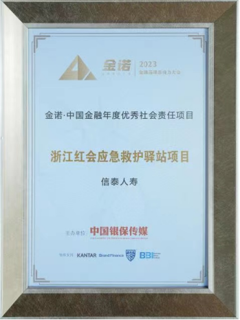 2023年5月9日,信泰保险“浙江红会应急救护驿站项目”获“中国金融年度优秀社会责任项目”称号。