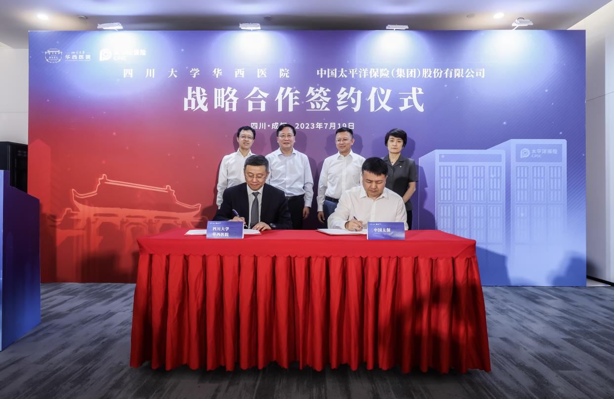 7月19日,中国太保、四川大学华西医院(以下简称华西医院)在四川成都签署战略合作协议,并成立“华西-太保联合创新中心”,合力探索优质医疗资源与商业保险支付融合发展的创新模式。华西医院院长李为民、中国太保董事长孔庆伟、华西医院党委书记李正赤、华西医院副院长吴泓、中国太保寿险董事长潘艳红、中国太保副总裁马欣等领导出席。