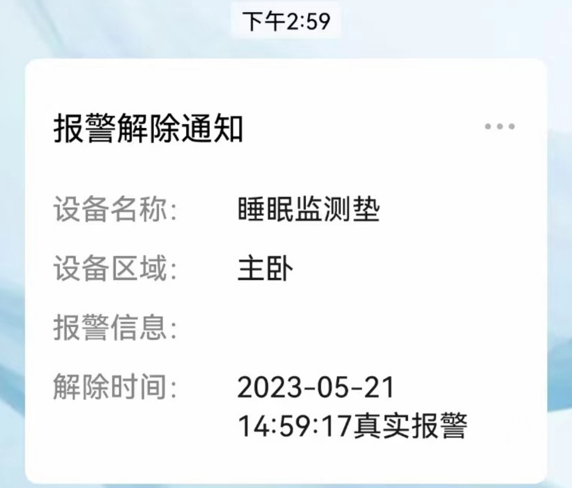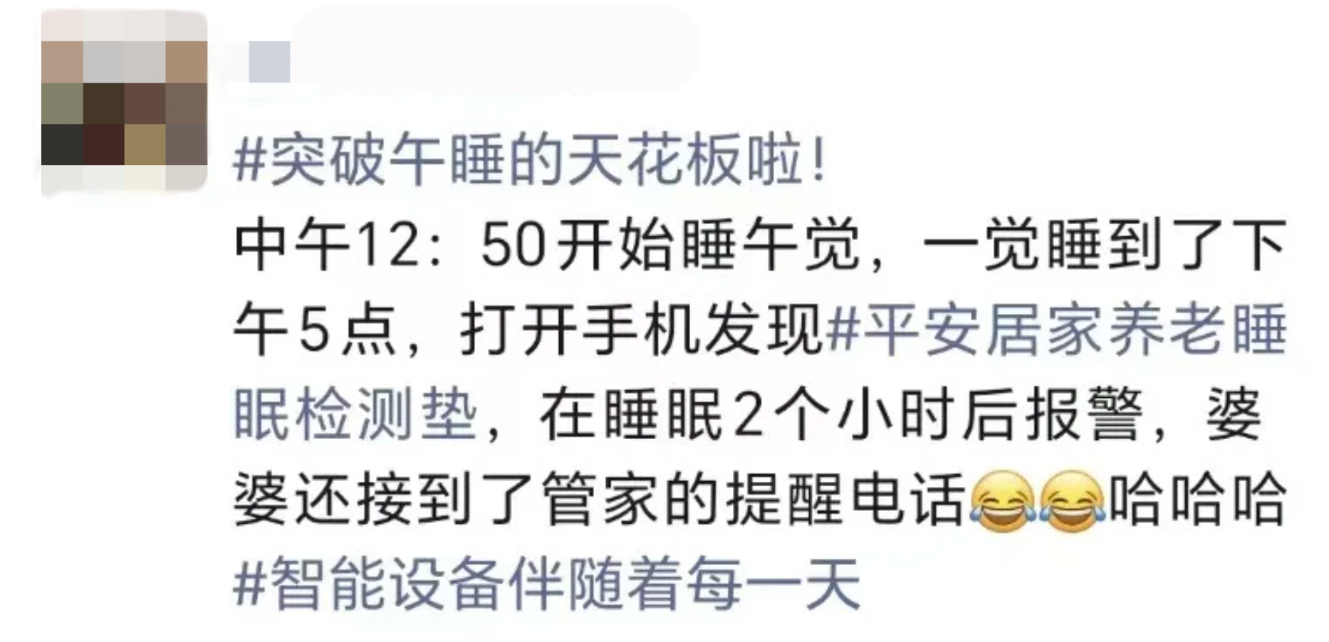 5月21日这天,孟女士的婆婆午睡时间过久,触发了睡眠监测垫的“白天久卧”告警,系统第一时间向孟女士发送短信和微信消息,提醒家属关注。与此同时,平安居家养老的“生活管家”也立即致电孟女士的婆婆,询问她是否身体不适、需不需要协助联系医生问诊。确认其身体无恙后,管家解除警报,并把处理结果推送给家属,第一时间让家属放心。事后,孟女士主动发布朋友圈,夸赞平安居家养老“智能守护设备陪伴每一天”。