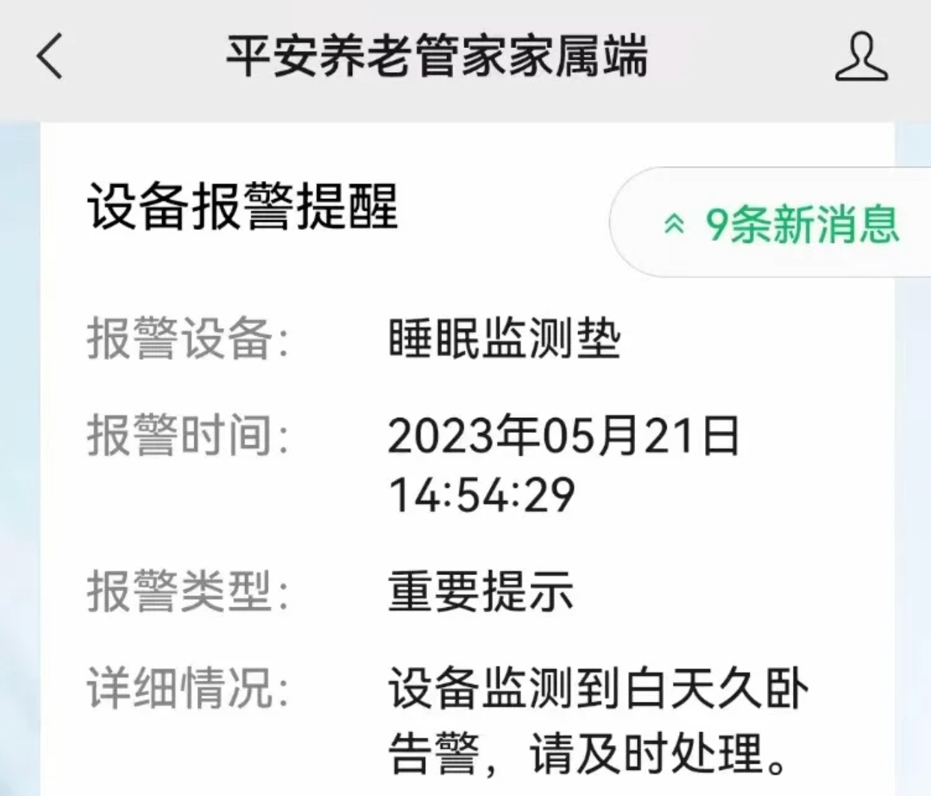 “重要提示:设备监测到白天久卧告警,请及时处理。”5月21日下午14:54,孟女士收到了一条系统预警短信,以及来自“平安养老管家家属端”的服务提示消息,提醒其关注家中老人的午睡时间是否过久。