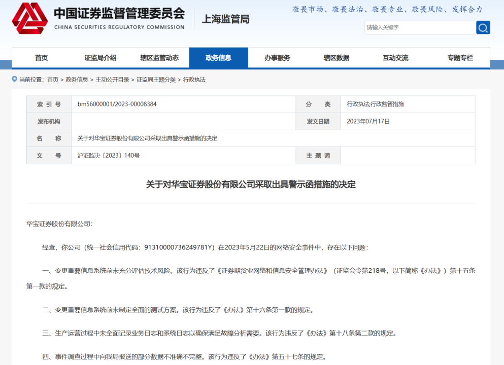 近日,上海证监局向华宝证券出具警示函,因华宝证券在5月22日的网络安全事件中存在变更重要信息系统前未充分评估技术风险、未制定全面的测试方案等问题。