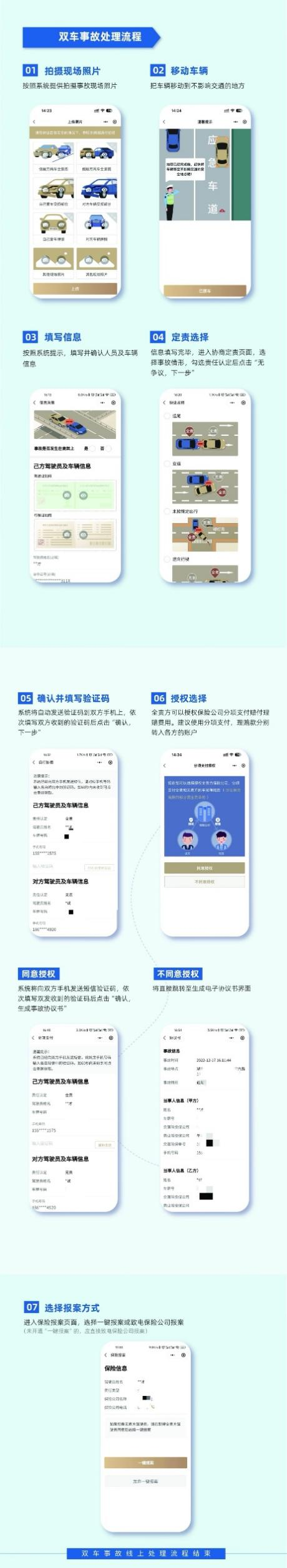 若为双车事故,车主可按照系统提示拍摄现场照片,随后移动车辆至不影响交通位置,填写确认人员及车辆信息,完成事故定责,责方授权理赔款分项支付,紧接着生成电子协议书,进入保险报案界面,完成事故生成。