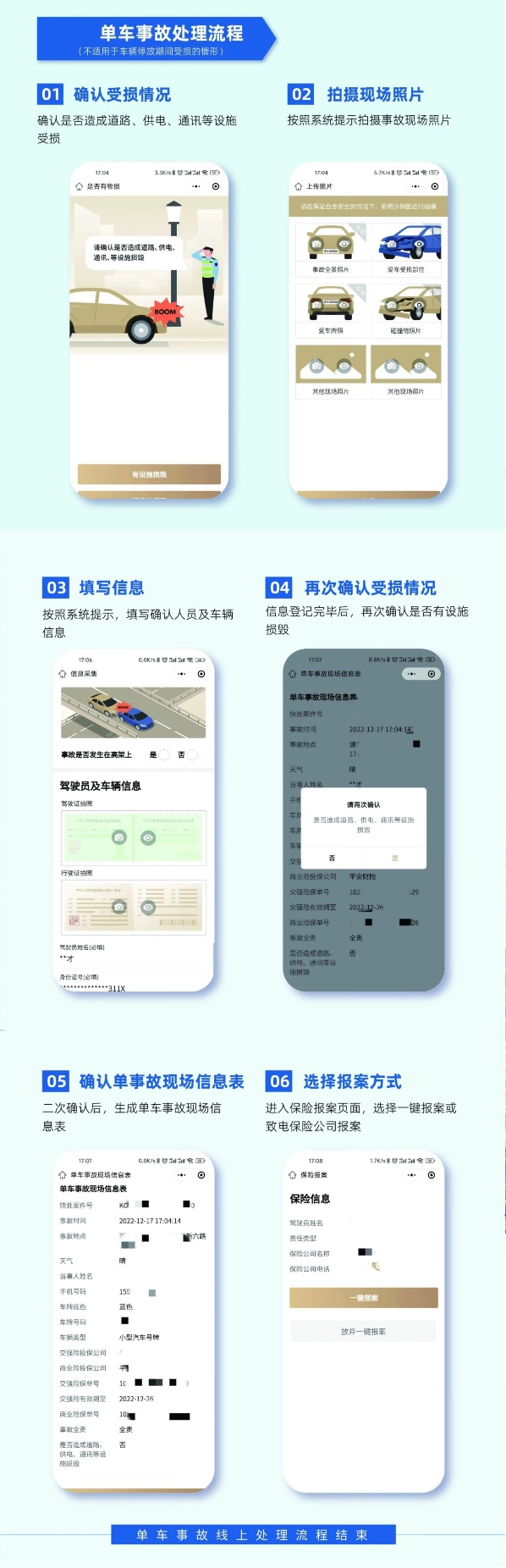 若为单车事故,车主需确认车辆受损情况,按照系统提示拍摄现场照片,填写确认人员及车辆信息,并确认是否有设施损毁,随后生成事故现场信息表,进入保险报案界面,完成事故生成。