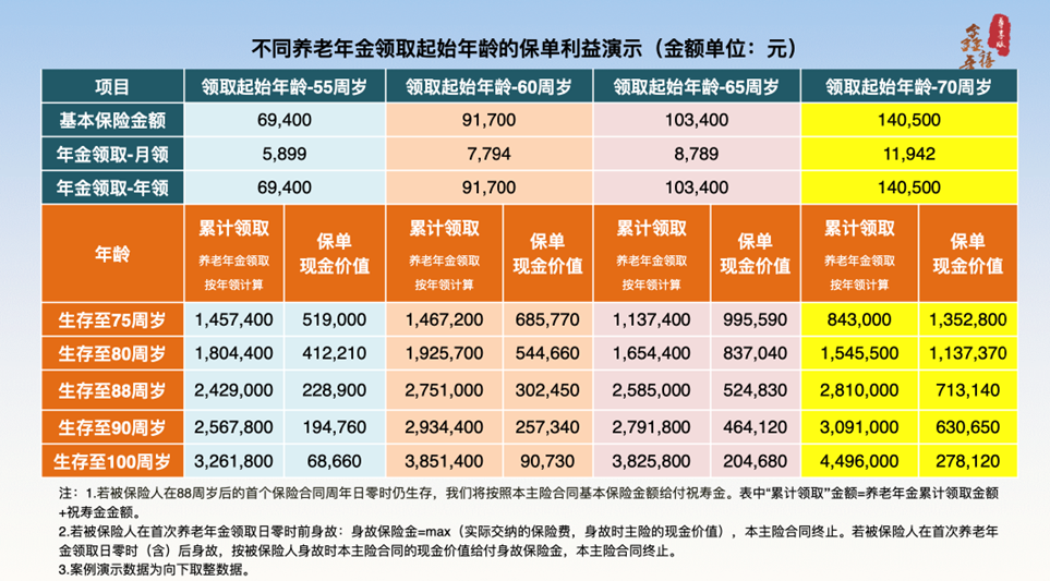 首先是方案灵活,“鑫禧年年”可提供两种保障方案任选,方案一的鑫禧“精彩养老计划”,即选择被保险人身故时按主险合同的现金价值给付身故保险金的方案,优势在于在合同有效期内被保险人生存期可领取养老年金、祝寿金的金额相对较多,主打提前规划和品质养老,特征是高领取,侧重于保障自身的养老品质;方案二的鑫禧“传世养老计划”,即选择本主险合同实际交纳的保险费与被保险人身故时按本主险合同的现金价值二者的较大者给付身故保险金的方案,特点是相较于方案一的高现价,主打精致养老和财富传承,在领取养老年金、祝寿金获得老年生活资金支持的同时,身故后可以留给后代更多资金,侧重于财富传承。