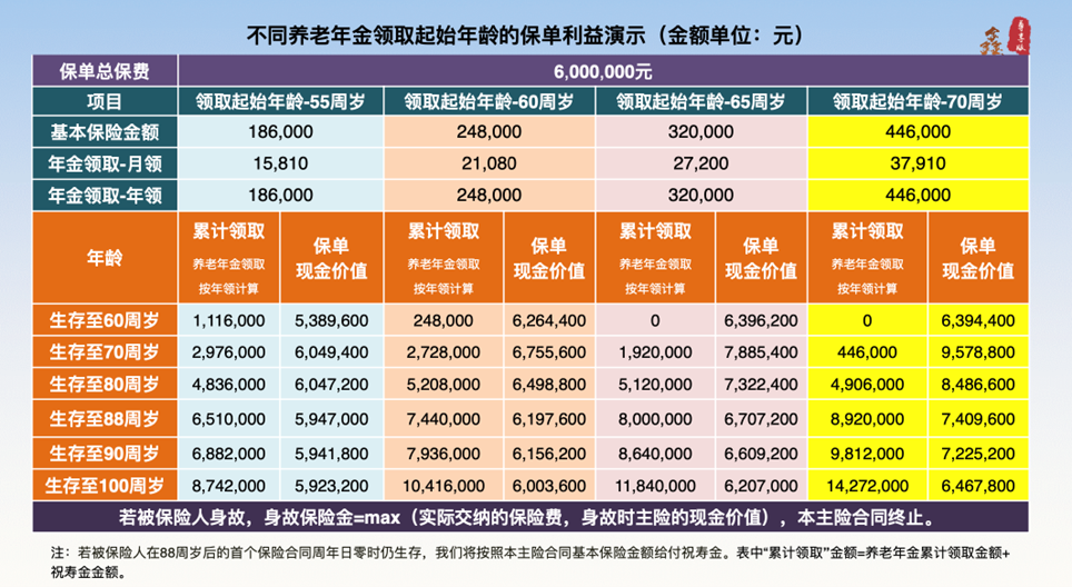 如果陈女士选择从60周岁开始领取养老年金,以月领方式每月领取21080元,以年领方式每年领取24.8万元;假设生存到80周岁,陈女士养老年金累计可以领取520.8万元,同时保单的现金价值已高达649.88万元。陈女士还可指定1人或多人为身故保险金受益人,可谓一份保单,既能保障自己养老,还可保证财富传承。