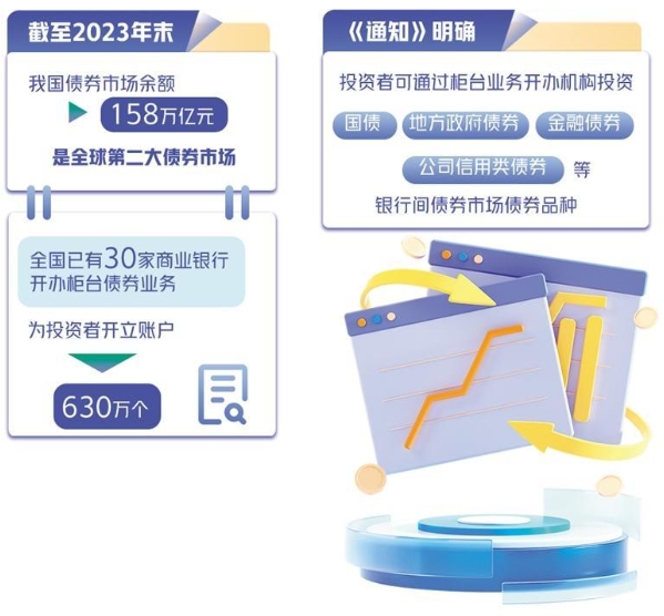 对于柜台债券业务对促进债券市场高质量发展的意义,中国人民银行有关负责人表示,一方面有利于拓宽居民投资渠道。目前,我国居民直接持有的政府债券规模较小,与成熟债券市场相比还有很大提升空间。通过柜台渠道投资债券市场,可以将储蓄高效转化为债券投资,增加居民财产性收入。另一方面有利于优化融资结构。截至2023年末,我国债券市场余额为158万亿元,是全球第二大债券市场。加快发展柜台债券业务,有利于促进直接融资发展,优化金融体系结构。此外,有利于多层次债券市场发展。柜台债券业务是银行间债券市场向零售金融和普惠金融的延伸。与集中统一的金融基础设施相比,柜台开办机构可为各类投资者提供债券托管、做市、担保品管理、清算结算一体化等各种灵活多元的综合性服务,提升市场活跃性,促进市场分层。