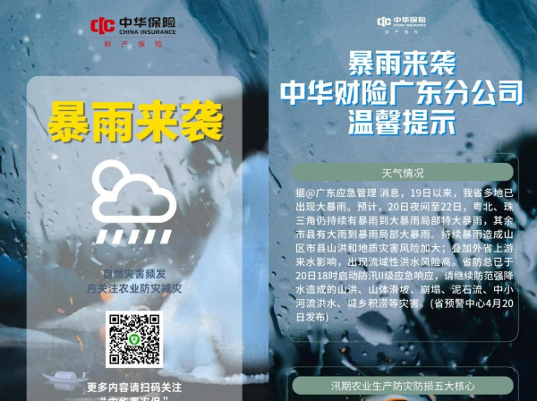中华财险广东分公司高度重视,全省启动大灾应急工作二级响应,成立以分公司一把手为组长的暴雨灾害应急领导小组,迅速召开防汛救灾部署会议,全力支持受灾农户恢复生产,最大程度降低灾害损失。截至4月21日12时,公司已派出560余人次理赔查勘人员、200余次车辆、20余驾次无人机,奔赴受灾一线开展理赔救援工作,持续发布预警信息,触达上万农户。