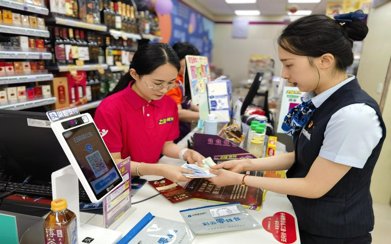 建行工作人员为昆明之佳便利店兑换“彩云零钱包”