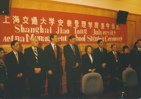 1996年,恰逢百年校庆,经原国家教委批准,上海交大与美国原Aetna国际集团合作共建管理学院,图为同年4月举行的上海交通大学安泰管理学院签字仪式。