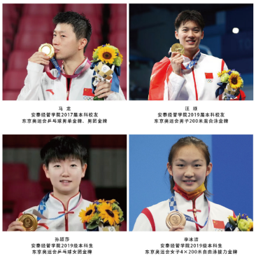2021年7月,上海交通大学安泰经济与管理学院2017届本科校友马龙、2019届本科校友汪顺及2019级本科生孙颖莎、李冰洁在东京奥运会获得金牌,为国争光。