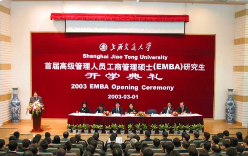 作为国务院学位办最早批准开办的EMBA项目,上海交通大学首批300余名EMBA学员于2003年入学,高管任职比例超过90%,此后历年招生规模与质量持续保持全国领先,图为2003年3月上海交通大学首届EMBA开学典礼。