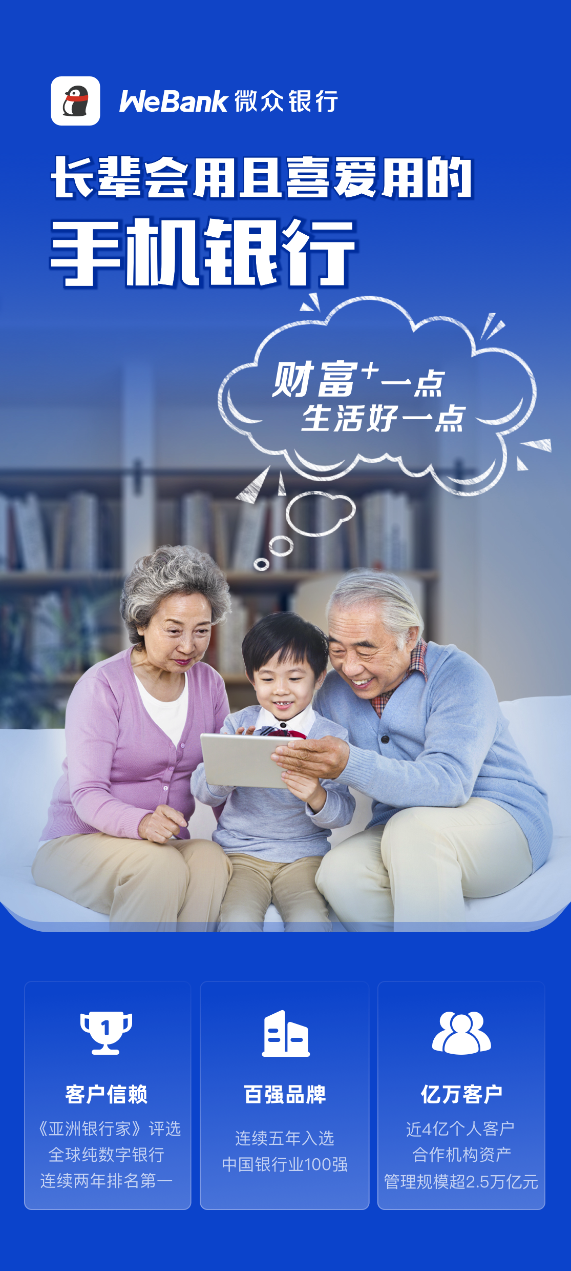 具体而言,微众银行于2021年10月上线了“微众银行财富+爸妈版”,为老年用户打造专属App版本,发挥自身科技的优势,持续探索为老年用户提供更贴心、安全的金融服务。