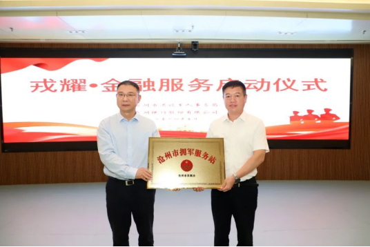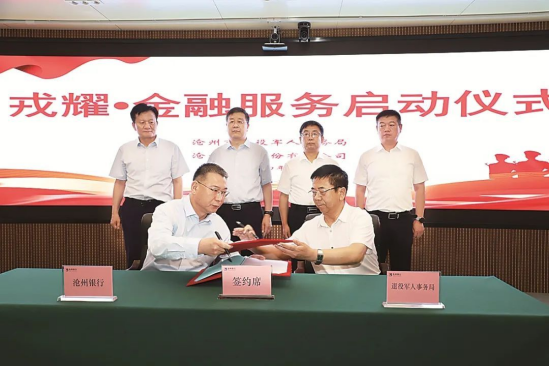 仪式上,沧州市退役军人事务局、沧州银行签署了合作备忘录。根据协议,沧州银行将为退役军人、现役军人及其军属、其他优抚对象打造六项专属“戎耀·金融服务”,即提供金融咨询、打造金融拥军服务站、开通客服专线、发行专属借记卡——“戎耀”卡、发行专属定期产品——“戎耀”存单及专享“一分钱乘车”活动。随后,沧州市退役军人事务局与会领导为沧州银行颁授了拥军服务站牌匾。