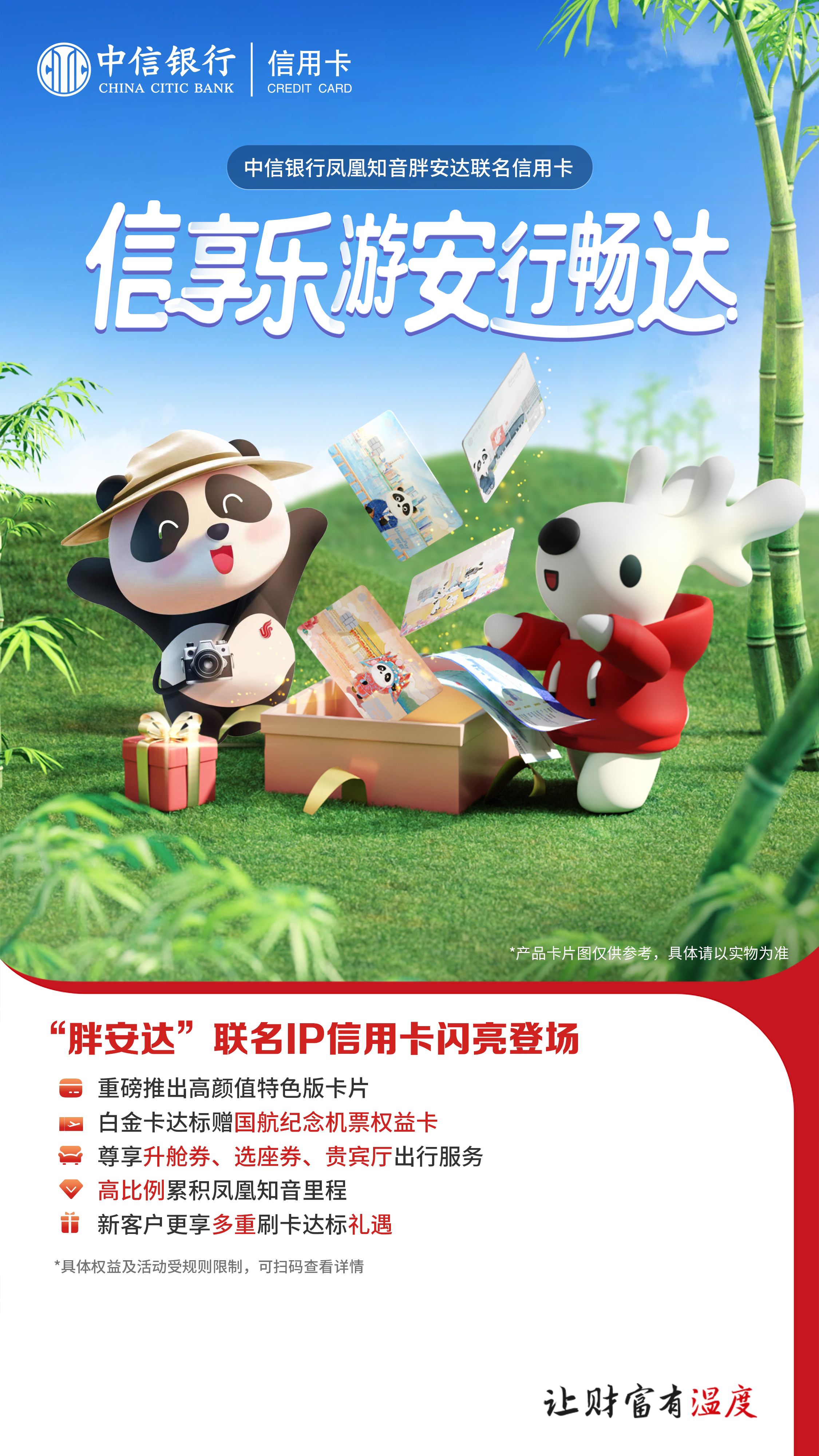在此背景下,适逢“凤凰知音”常旅客计划30周年之际,双方携手发行胖安达联名信用卡,充分发挥国航高品质出行和“凤凰知音”会员服务优势以及中信银行在商旅客群经营、差异化金融服务、多元化消费场景布局等方面的优势,以丰富的产品和权益体系,针对当前年轻出行客群、高频商旅客户的需求,升级“金融+商旅”服务生态,在为广大客户带来出行新体验的同时,进一步增强双方客户的品牌粘性和忠诚度,为持续释放商旅出行价值注入新动能。