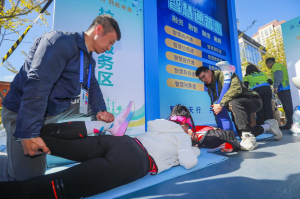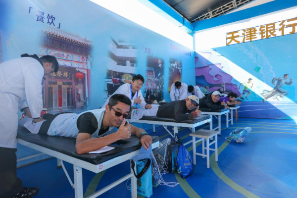 在半马、全马终点处,“天行志愿服务站”格外抢眼,贴心温暖的专业服务获得参赛者纷纷点赞。现场共计安排13个医疗服务小组,配备专业医生、筋膜枪等,提供赛后基本身体检查、拉伸放松、应急损伤处理等专业服务以及高效的肌肉舒缓体验。服务区内还展示了马拉松联名贵金属、马拉松主题理财产品、马拉松主题大额存单、天津银行运动主题借记卡--悦动卡等产品,让参赛者在休闲放松的同时,享受优质、便捷的金融服务。