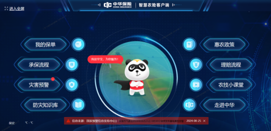 中华财险“智慧农险客户端”是充分运用大数据、可视化、数据建模等信息化高新技术,打造的“智慧农险”客户平台服务平台。该平台将农业种植保险、养殖保险、农机具保险、高标准农田保险、农村综合等涉农保险产品集中至“智慧农险客户端”,一是实现了农业保险标的全生命周期保障监测、全流程数据监测;二是实现了农业保险保单全流程展示、灾害预警、风险减量、精准承保理赔、自动续保、农技培训、政策宣传等服务功能集中应用,践行了中华保险以客户为中心,“一个客户,一个中华,多个产品,综合服务”的客户经营理念,提升了客户体验和满意度,为农业生产企业(或客户)提供全自动化、可视化的农业保险服务,提升农业生产抗风险能力,达到农业生产丰收、农业保险风险减量的目的。