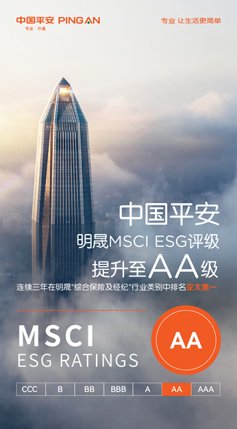 12月5日,国际权威指数机构MSCI更新2024年度环境、社会及治理(ESG)评级信息。中国平安凭借在ESG方面的优异表现,最新评级上调至AA级,连续三年位列“综合保险及经纪”亚太区前列。MSCI认为,相较同行,中国平安具备更强的人才吸引及留用举措,更积极且稳健地把握普惠金融机遇,具备完善的数据保护流程体系。