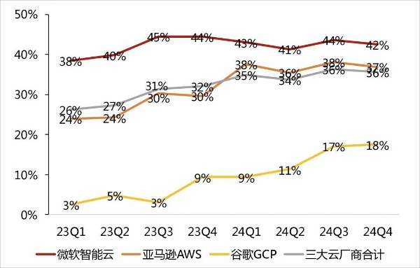 根据海外三大云厂商官方披露的2024年营收数据归纳情况,2024年第四季度云业务收入金额亚马逊AWS保持行业领先。具体表现为:亚马逊288亿美元,微软255亿美元,谷歌120亿美元。值得关注的是,三大云厂商云业务收入均低于预期,其中微软智能云实际业绩255亿美元,市场预期为259亿美元;谷歌云实际收入120亿美元,市场预期为122亿美元;亚马逊实际收入287.86亿美元,市场预期为288.14亿美元。