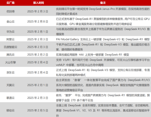 部分国内公有云厂商接入DeepSeek模型一览(图片来源:民生证券,Wind)