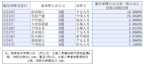 3月13日,平安资管受托平安人寿资金,投资于招商银行H股股票,达到招商银行H股股本的10%,触发举牌。