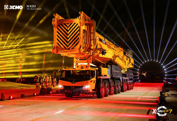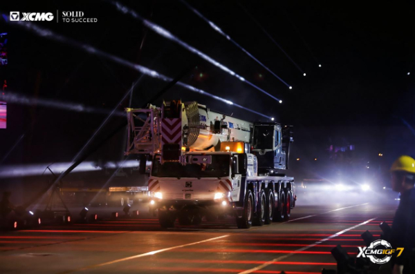 16台起重机列阵如虹,XCA900L8—1全地面起重机领衔,轮式与履带产品组成“钢铁舰队”。车队驶过观礼台,客户纷纷举起手机定格画面,客商高呼:“Amazing。”鸣笛声中,设备驶向全球,灯光在夜幕中汇成“时光隧道”,照亮远征之路。