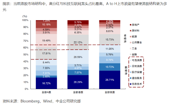 当前港股市场结构中,高分红与科技互联网龙头占比最高,A to H上市浪潮有望使港股结构更多元