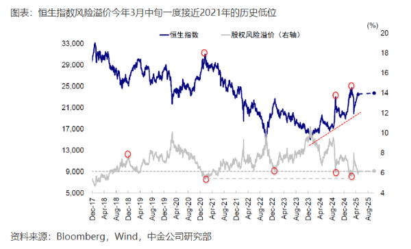 恒生指数风险溢价(ERP)今年3月中旬一度接近2021年的历史低位