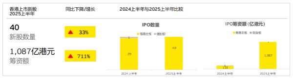 据该报告统计,2025年上半年,香港市场预计约有40家公司首发上市,筹资额约1087亿港元。与去年相比,IPO数量和筹资额分别上涨33%和711%,预计将超过去年全年IPO筹资总额。