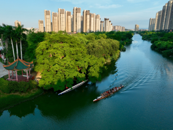 福州打造山水宜居之城,龙舟爱好者在福州流花溪上划龙舟(无人机照片)。新华社记者姜克红摄