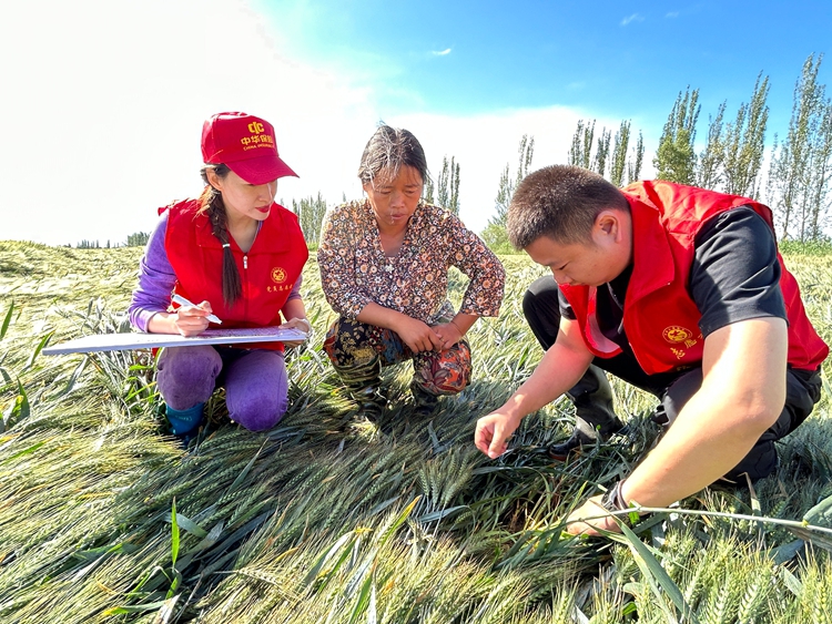 中华财险阿拉尔分公司农险查勘员在受灾现场为农户核定损失(8月13日摄)。图片由中华财险新疆分公司提供