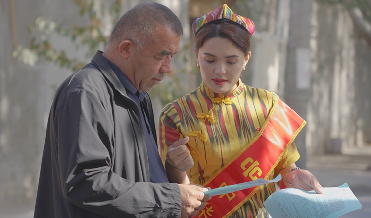 党的二十大代表、中华财险克州分公司员工拜合提努尔·达米拉向群众宣传党的惠民政策(2024年10月14日摄)。图片由中华财险新疆分公司提供
