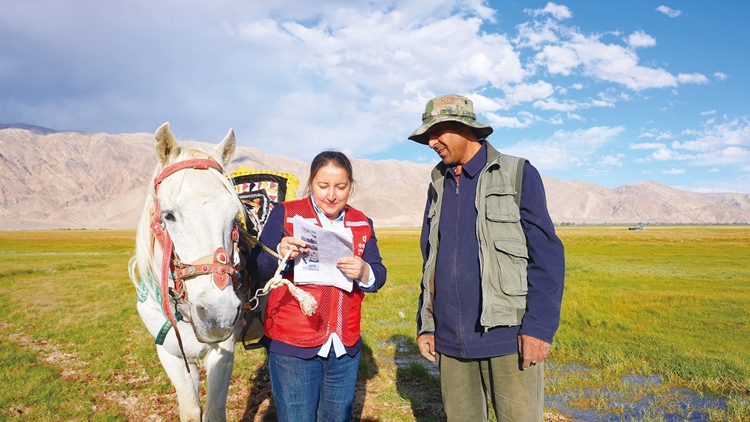 中华财险塔什库尔干塔吉克自治县支公司在帕米尔高原开展“马背上”的保险服务(9月18日摄)。图片由中华财险新疆分公司提供