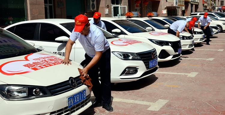 中华财险新疆分公司爱心送考车整装待发(2022年6月6日摄)。图片由中华财险新疆分公司提供