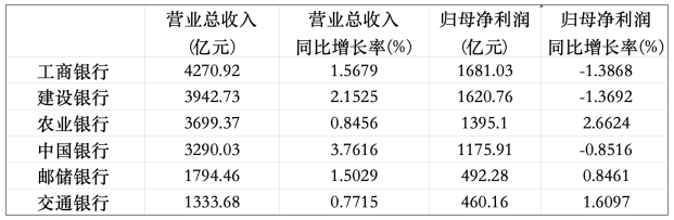 归母净利润方面,工商银行以1681.03亿元位居第一,建设银行紧随其后,实现归母净利润1620.76亿元,农业银行、中国银行归母净利润均超千亿元,从增速情况来看,农业银行归母净利润同比增长2.66%,位居六大行首位。